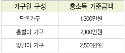 2015년도 연간 부부합산 총소득(사업소득+근로소득+기타소득+이자‧배당‧연금소득)이 가구원 구성에 따라 정한 총소득 기준금액 미만이어야 한다.