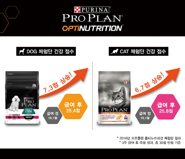 프로플랜 옵티뉴트리션 체험단은 지난 9월 26일부터 10월 23일까지 약 3주간 반려동물의 건강 상태와 연령에 맞는 프로플랜 옵티뉴트리션 제품을 직접 급여해 매주 피부, 털, 배변, 치아, 활동성, 눈 상태를 확인해 반려동물의 건강 점수를 측정했다.