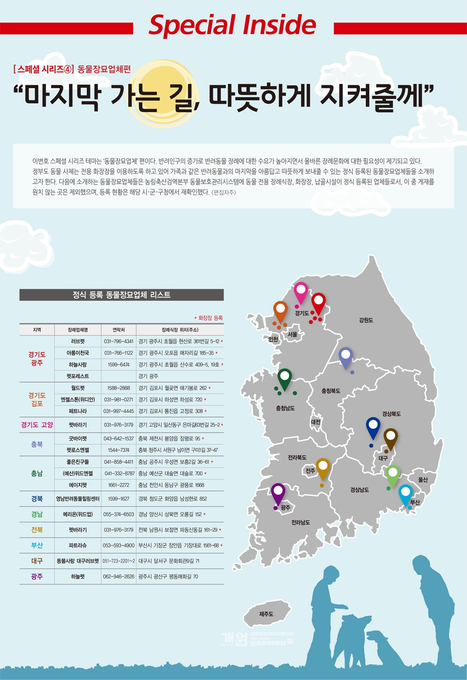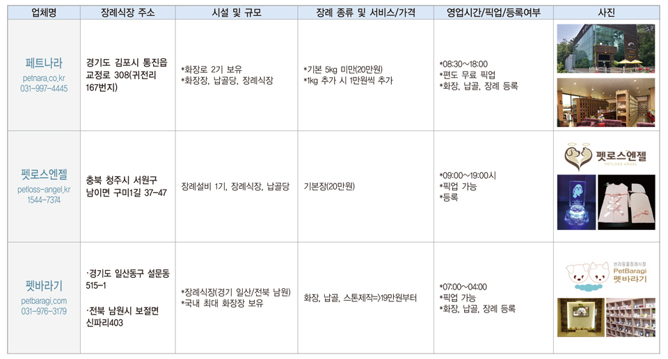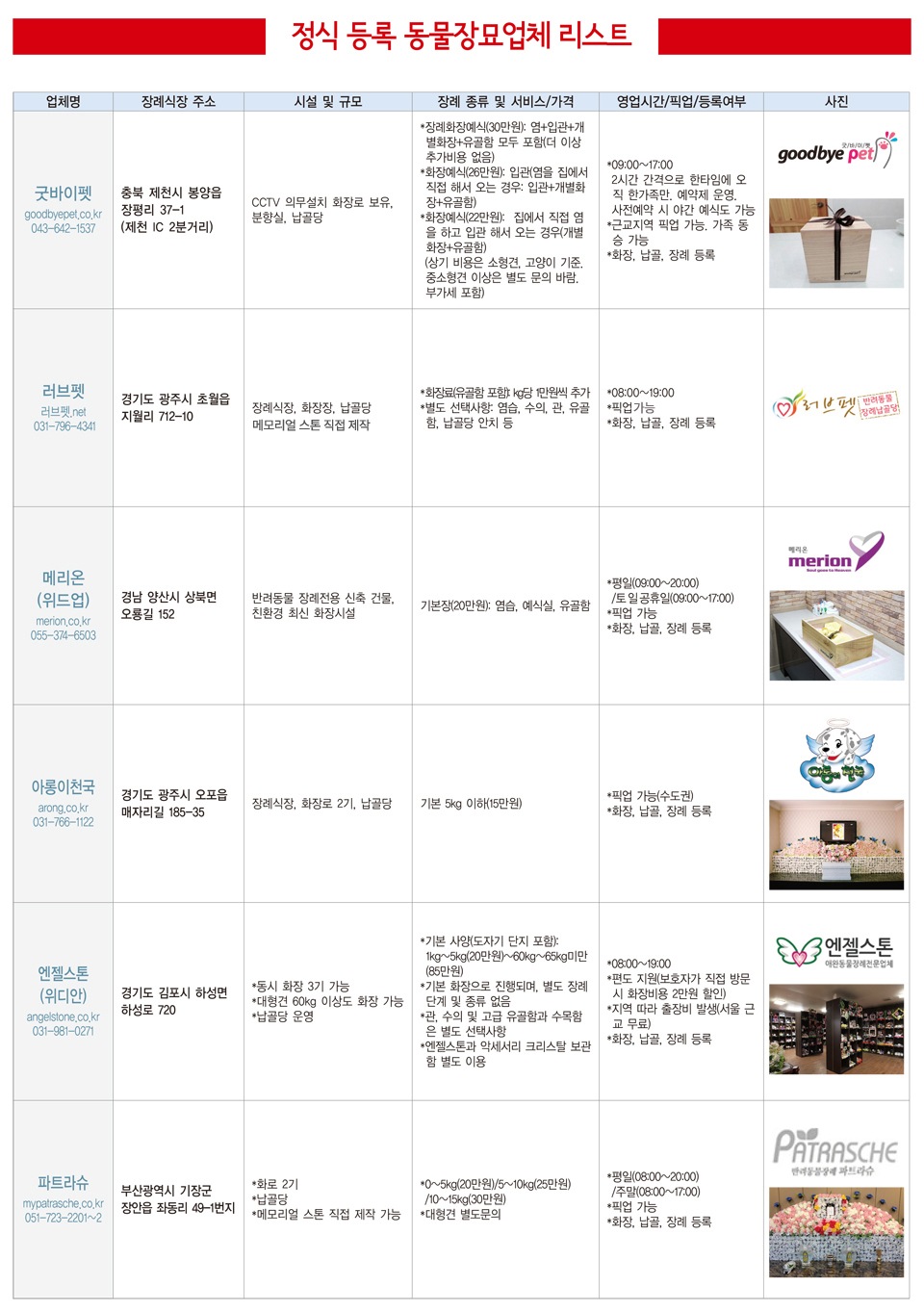 정부도 동물 사체는 전용 화장장을 이용하도록 하고 있어 가족과 같은 반려동물과의 마지막을 아름답고 따뜻하게 보내줄 수 있는 정식 등록된 동물장묘업체들을 소개하고자 한다. 다음에 소개하는 동물장묘업체들은 농림축산검역본부 동물보호관리시스템에 동물 전용 장례식장, 화장장, 납골시설이 정식 등록된 업체들로서, 이 중 게재를 원치 않는 곳은 제외했으며, 등록 현황은 해당 시‧군‧구청에서 재확인했다. <편집자주>