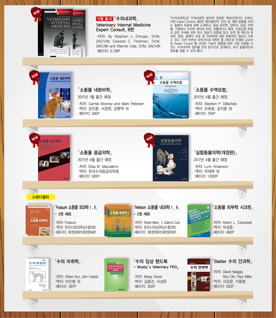 수의학 전문 출판사 오케이벳이 올해의 마지막 신간으로 『수의내과학(Veterinary Internal Medicine)』을 출간했다. 또한 2017년 상반기에는 임상수의사들에게 필요한 『소동물 내분비학』, 『소동물 수액요법』, 『소동물 응급의학』, 『실험동물의학(개정판)』을 연이어 출판할 예정이다.
