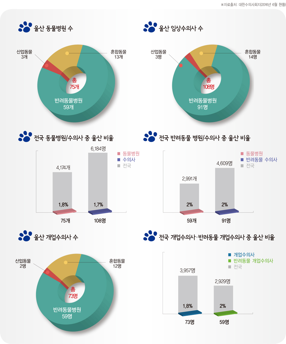 울산광역시울산 동물병원 75개‧수의사 108명 전국 병원 중 울산에 1.8% … 전체 수의사 중 1.7% 분포 저작권자 © 데일리개원 무단전재 및 재배포 금지 개원 다른기사 보기 페이스북 트위터 URL복사 네이버라인 기사공유하기