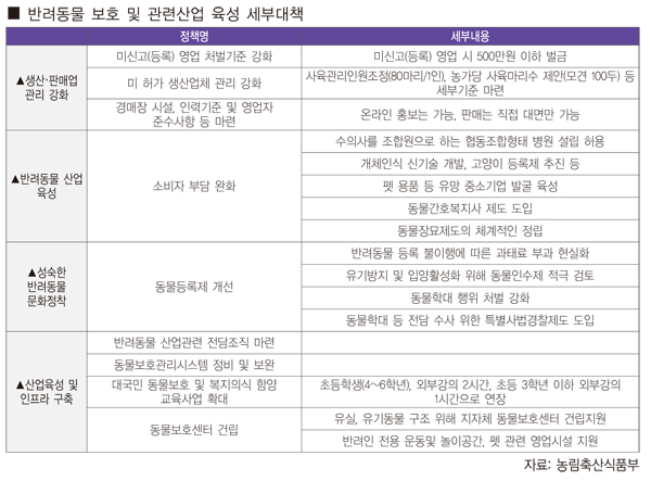 정부가 발표한 반려동물 육성 정책은 △생산・판매업 관리・감독 강화 △반려동물 관련 산업의 건강한 육성 △성숙한 반려동물 문화 정착 △산업육성 인프라 구축 및 일자리 창출 등 4가지로 요약된다.
