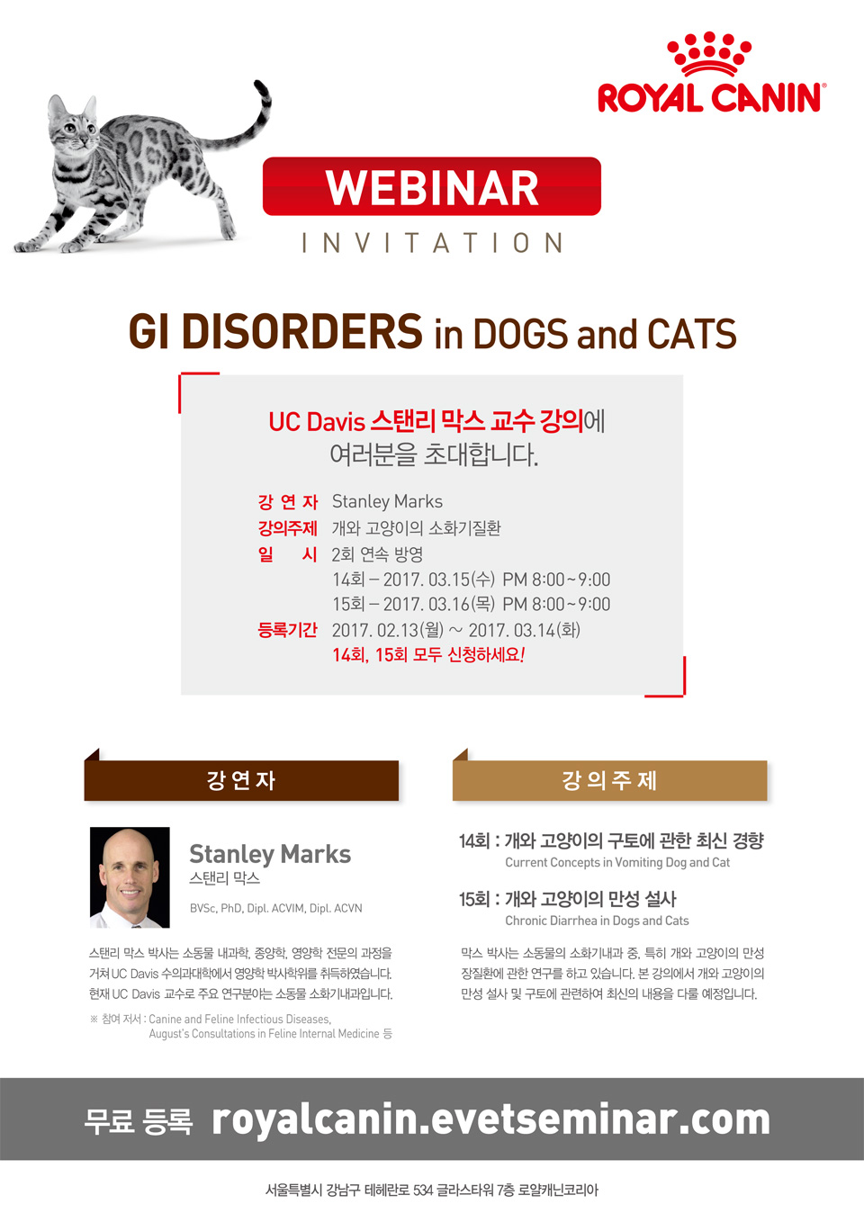 로얄캐닌코리아(대표 박성준)는 오는 3월 15일(수)과 16일(목) 오후 8시부터 9시까지 2회 연속으로 스탠리 막스 교수의 강의를 진행한다.