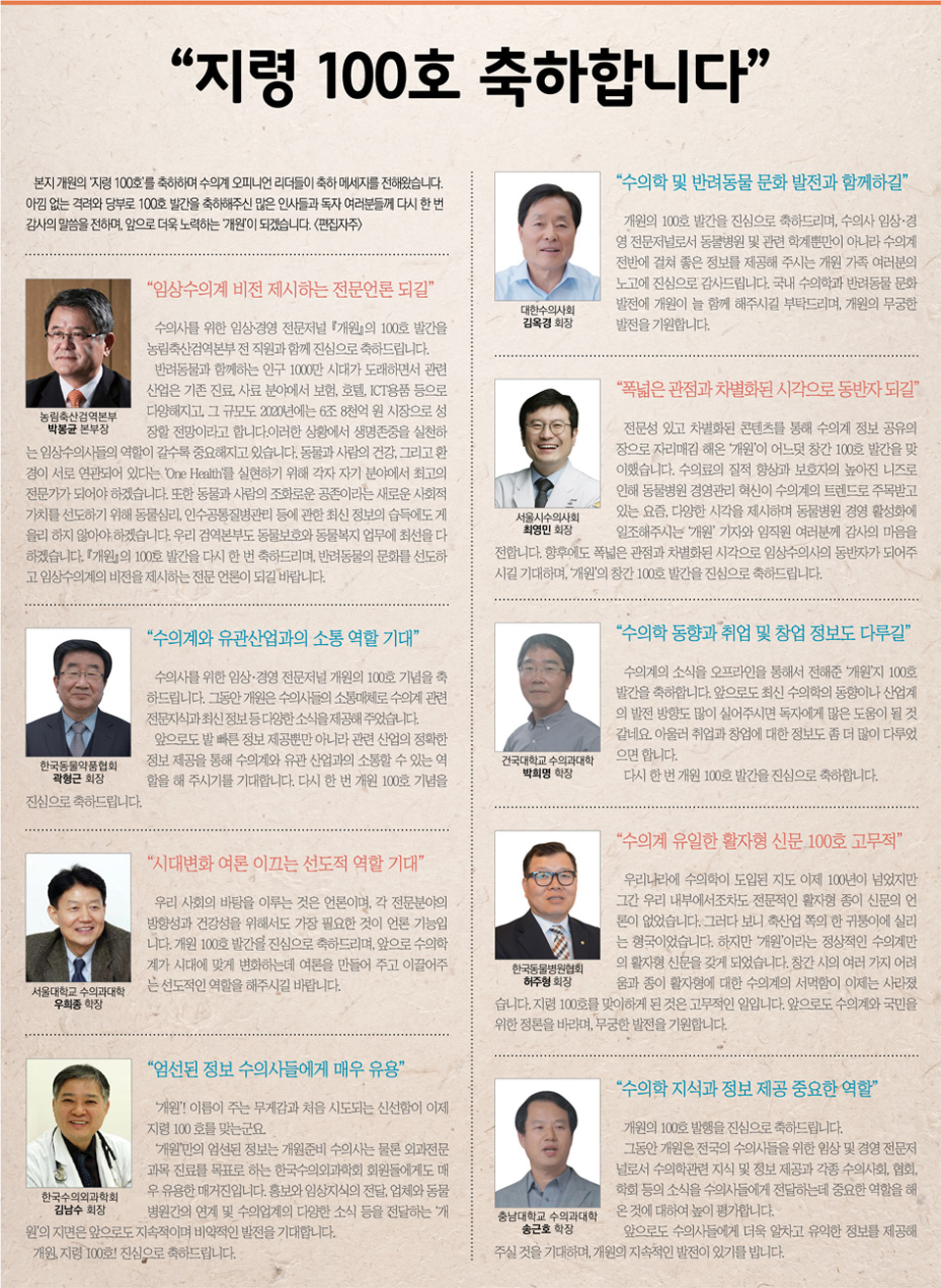 본지 개원의 ‘지령 100호’를 축하하며 수의계 오피니언 리더들이 축하 메세지를 전해왔습니다. 아낌 없는 격려와 당부로 100호 발간을 축하해주신 많은 인사들과 독자 여러분들께 다시 한 번 감사의 말씀을 전하며, 앞으로 더욱 노력하는 ‘개원’이 되겠습니다. <편집자주>