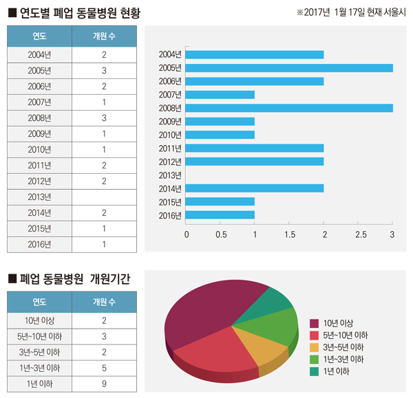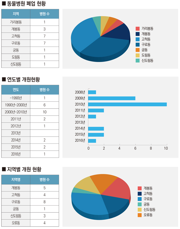 2004년부터 지금까지 21개소의 동물병원이 폐업한 것으로 조사됐다. 폐업한 지역은 구로동과 고척동이 많았다.