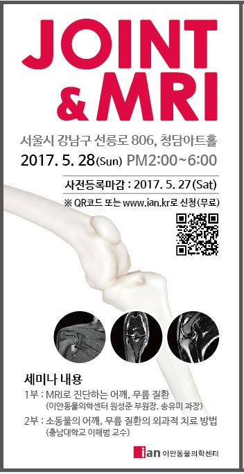 이안동물의학센터(대표 이인)가 오는 5월 28일(일) ‘JOINT & MRI 세미나’를 개최한다.