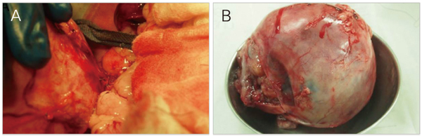 환자는 X-ray 검사상 우측 신장영역에서 연부조직 밀도의 큰 종괴가 관찰되었다, 초음파 검사에서 중복부 영역의 고에코성 종괴, 복강 내 저에코성 복수 소량, 방광 내 고에코성 액체 충만 소견이 관찰되었다. 배설성 요로조영술을 실시하니 우신에 조영이 되지 않았다. 따라서 복부 종괴를 오른쪽 신장이라 판단하였고, 다음날 오른쪽 신장적출 후 조직검사를 의뢰하였다.
