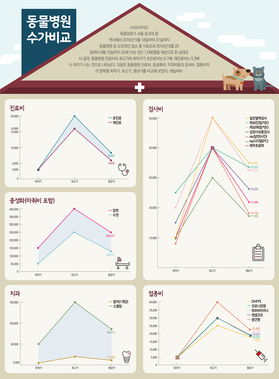 (사)소비자교육중앙회가 서울 및 6대 광역시에서 2016년 5월 18일부터 31일까지 동물병원 등 오프라인 업소 총 156곳과 2016년 8월 20일부터 9월 10일까지 20세 이상 성인 1,000명을 대상으로 한 실태조사 결과, 동물병원 진료비의 최고가와 최저가가 초진료비는 6.7배, 재진료비는 5.3배나 차이가 나는 것으로 나타났다. 다음은 동물병원 진료비, 중성화비, 치과비용과 검사비, 접종비의 각 항목별 최저가, 최고가, 평균가를 비교해 보았다. <편집자주>