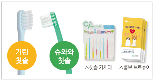 칫솔 종류와 상관없이 200개 이상 구입하면 Ci메디컬 칫솔 데스크 거치대와 홍보 브로셔를 무료로 제공하며, 동물병원 홍보 판촉물용으로 300개 이상 주문 시 동물병원 로고와 전화번호를 칫솔 포장지에 무료로 라벨링 해 주는 서비스를 제공할 예정이다.