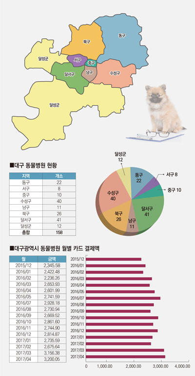 대구시 동물병원에서 사용되는 월 평균 결제액은 2017년 4월 기준으로 32억 원 정도로 나타났다. 부산에 비해 대구는 동물병원 카드 사용액이 14억 원 정도 적지만, 가축을 키우는 농가가 부산에 비해 많은 것으로 나타났다.