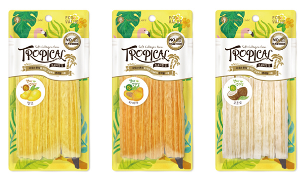 열대과일을 대표하는 세 가지 맛으로 구성된 ‘에코밸류 트로피칼 소프트껌’은 일반 소가죽 껌에 비해 위장부담이 적은 돈피 껌으로, 100% 국내산 돈피를 사용하여 풍부한 양질의 콜라겐이 반려견의 피모 건강에 도움을 준다.