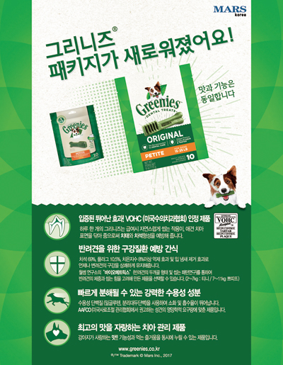 미국수의치과협회(VOHC)가 뛰어난 효과를 인정한 ‘그리니즈’가 새로운 패키지로 출시된다.