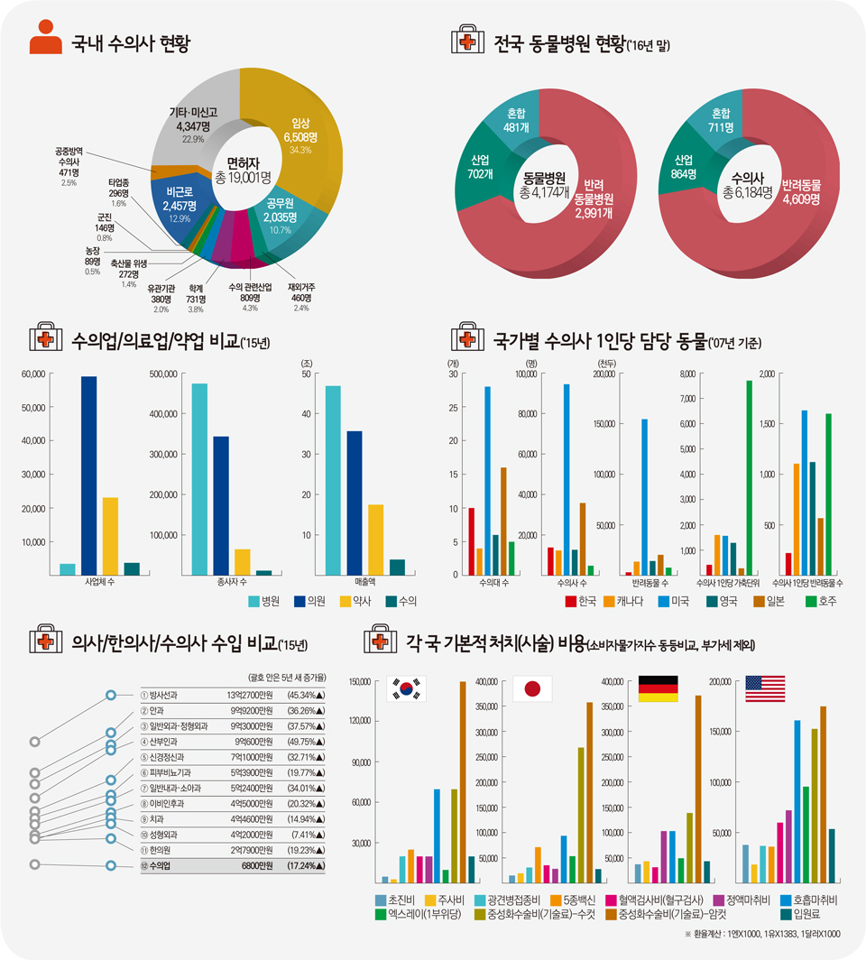 한국농촌경제연구원 주최로 지난 7월 13일 열린 ‘반려동물 연관산업 육성을 위한 정책토론회’에서 대한수의사회가 발표한 ‘반려동물 수의서비스 현황과 개선 과제’에 따르면, 국내 수의사 총 면허자 19,001명 중 임상수의사가 34.3%였으며, 2016년 말 동물병원은 총 4,174개로 반려동물병원이 2,991개, 수의사는 총 6,184명으로 반려동물 수의사는 4,609명으로 나타났다. 수의사 1인당 반려동물 수는 2007년 기준 223명으로 미국 1,645명, 호주 1,612명, 영국 1,130명, 캐나다 1,114명, 일본 571명과 큰 차이를 보였다. <편집자주>