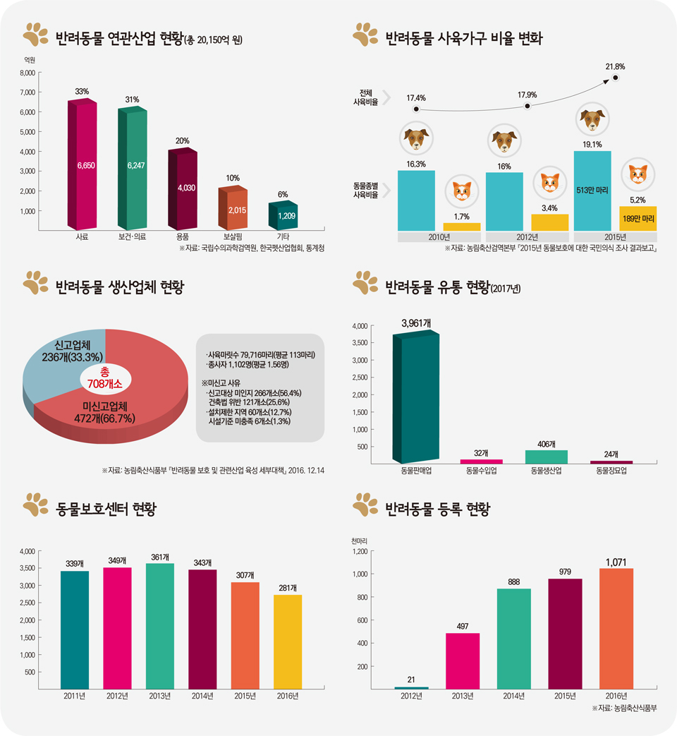 한국농촌경제연구원 주최로 지난 7월 13일 열린 ‘반려동물 연관산업 육성을 위한 정책토론회’ 발표 자료에 따르면, 반려동물 산업은 2조150억 원 시장으로 이 중 보건‧의료가 6,247억 원 규모로 31%를 차지했다. 반려동물 사육 현황은 2015년 기준 개 513만 마리, 고양이 189만 마리 등 약 1,000만 마리인 것으로 조사됐다. 또한 반려동물 전체 생산업체는 708개소, 동물판매업 3,961개, 동물수입업 32개, 동물생산업 406개, 동물장묘업 24개를 비롯해 동물보호센터는 2016년 281개소로 감소했으며, 반려동물 등록 현황은 2016년 1,071천 마리로 나타났다. <편집자주>