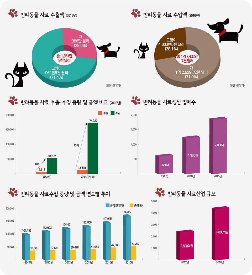 반려동물 사료 수출액은 2016년 1,351만8천 달러로 개 386만 달러(28.6%), 고양이 962만5천 달러(71.4%)로 고양이 비중이 훨씬 큰 반면, 같은 해 수입액은 1억 7,432만7천 달러로 개 1억 2,529만2천 달러(71.9%), 고양이 4,603만5천 달러(28.1%)로 개 비중이 훨씬 크게 나타났다.