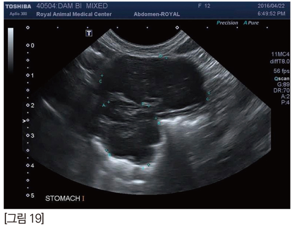 이 종괴는 초음파 검사상 위벽을 중심으로 위 내강과 바깥쪽으로 돌출된 형태로 확인 되었으며, 인접한 림프절 종대는 관찰되지 않았습니다. [그림 19]