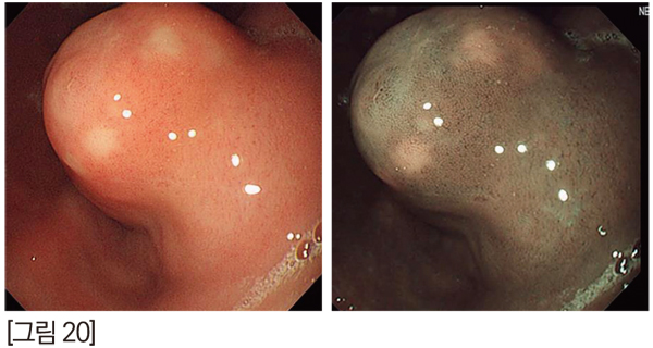 백색광으로 관찰했을 때 표면의 색이나 형태가 규칙적입니다. NBI 영상으로 봤을 때도 microvascular pattern과 microsurface pattern이 규칙적인 것으로 보아 양성 병변으로 짐작할 수 있습니다. [그림 20]