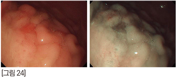 백색광으로 관찰했을 때 표면의 색은 균일하나 형태가 불규칙하여 악성으로 의심해 볼 수 있습니다. 하지만 NBI 영상에서 microvascular pattern과 microsurface pattern이 규칙적인 것으로 보아 악성 병변은 아닌 것으로 추정해 볼 수 있습니다. [그림 24]