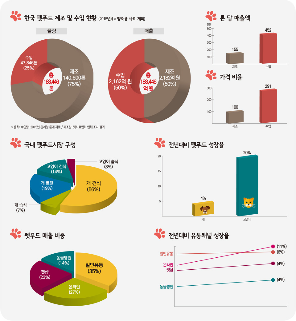 한국농촌경제연구원 주최 ‘반려동물 연관산업 육성을 위한 정책토론회’에서 한국펫사료협회가 발표한 자료에 따르면, 국내 펫푸드시장 전체 제조 물량은 총 140,600톤(75%)으로 매출액은 2,182억 원(50%)으로 나타났다. 또 수입 물량은 47,846톤(25%)으로 매출액 2,162억 원(50%)로 조사됐다. 제조와 수입을 모두 합한 전체 펫푸드 시장은 물량 총 188,446톤으로 4,344억 원(전년대비 7% 성장)을 기록했다. 톤당 매출액은 제조 155만원, 수입 452만원으로, 가격은 수입이 제조에 비해 2,9배 높은 것으로 나타났다. 펫푸드 중 반려견 푸드가 전체 82%를 차지했으며, 전년대비 성장률은 개 4%, 고양이 20%로 반려묘가 펫푸드 시장의 성장을 주도하는 것으로 나타났다. 온라인 시장도 꾸준히 성장해 다른 유통 채널과 비교해 전년대비 금액 성장율 11%로 유일하게 두자릿 수 성장을 나타냈다. <편집자주>
