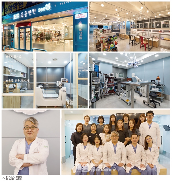 현재 시유동물메디컬센터에는 수의사만 8명이다. 야간 담당 2명, 진료부장, 외과과장, 내과과장, 피부과과장, 영상과장 등 모두 대학원 전공자들이다. 이 중에는 미국 재활치료 전문자격 CCRT 1차를 끝내고 2차 과정 중인 수의사와 미국 침자격증 CVA를 보유한 수의사도 있다. 정언승 원장도 CVA 4단계까지 마친 상태다.