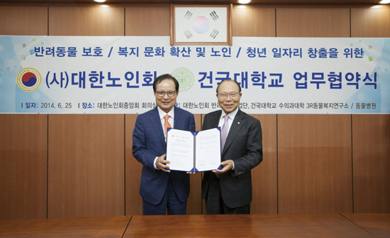 건국대학교(총장 송희영)가 지난 6월 25일(수) 서울 용산구 대한노인회에서 대한노인회와 ‘노인-청년층 일자리 창출을 위한 상호 협력 협약’을 체결했다.