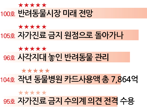 보도기사에서는 특집기사로 다뤘던 ‘반려동물시장 미래 전망’이 가장 많은 조회수를 기록했고, 이어 ‘자가진료 금지 원점으로 돌아가나’, ‘사각지대 놓인 반려동물 관리’, ‘작년 동물병원 카드사용액 총 7,864억’, ‘자가진료 금지 수의계 의견 전격 수용’ 순으로 나타나 동물병원 시장 상황과 미래 전망에 대한 관심과 특히 자가진료에 대한 관심이 높은 것으로 나타났다.