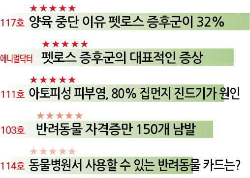 2위로 높은 조회수를 기록한 기사 역시 ‘펫로스 증후군의 대표적인 증상’이었으며, 이어 ‘강아지 고양이 아토피성 피부염, 약 80% 집먼지 진드기가 원인’, ‘반려동물 자격증만 150개 남발’, ‘동물병원서 사용할 수 있는 반려동물 카드 종류는?’ 순으로 나타났다.