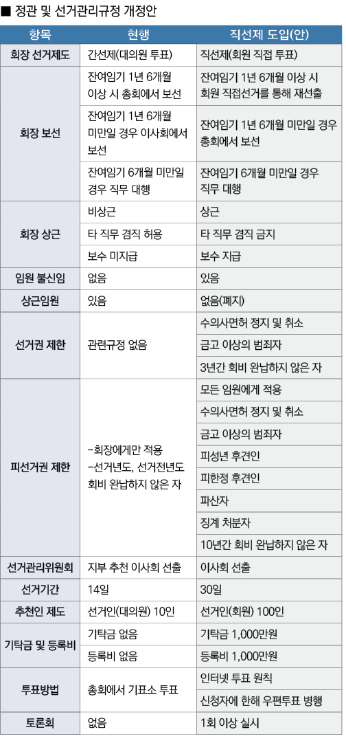 이를 바탕으로 특위가 제안한 ‘직선제 도입(안)’에 따르면, 회장직을 △상근 △겸직금지 △보수지급으로 바꾸고, 선거인(회원) 100인의 추천을 받아 선거기간을 14일에서 30일로 연장하며, 임원불신임제를 도입한다.