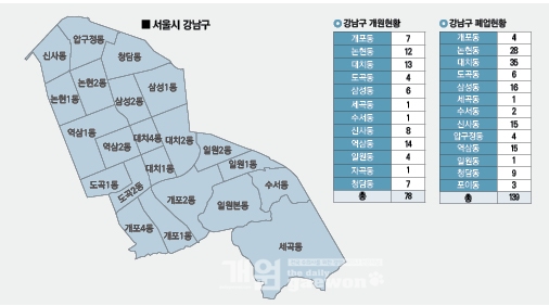 2018년 1월 현재 강남구에 개원하고 있는 동물병원은 78개소다. 1995년부터 217개소의 동물병원이 개원했지만 139개소가 폐업을 했다. 그 중 34곳은 1년을 채우지 못하고 폐업했다. 다른 지역에 비해 높은 임대료가 부담으로 작용해 1년 미만의 개원이 많은 것으로 보인다.