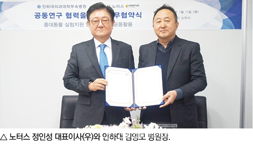 비임상 CRO기관 (주)노터스(대표 정인성)와 인하대의과대학부속병원(병원장 김영모)이 공동 연구 협력을 위한 상호협력 협약식을 지난 1월 11일 노터스 본사에서 진행했다.