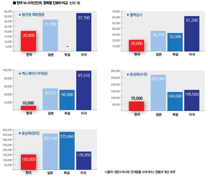 대한수의사회가 ‘반려동물 수의서비스 현황과 개선 과제’에서 밝힌 각 국의 기본적 처치 및 시술 비용에 따르면, 혈액검사비의 경우 우리나라는 2만원, 일본 35,714원, 독일 32,000원, 미국 61,200원으로 조사됐으며, 엑스레이는 1부위 당 우리나라 10,000원, 일본 53,571원, 독일 50,000원, 미국 97,410원으로 조사됐다.
