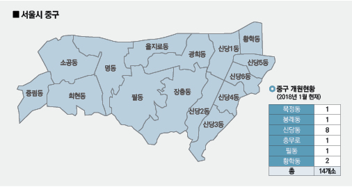 서울에서 교통이 가장 좋은 중구는 인구가 적은 지역이다. 상업지가 많아 땅값이 비싸다보니 개발이 쉽지 않은 동네였기 때문이다. 그러나 최근 서울에서 중구를 중심으로 도심개발을 진행하고 있는 곳이 많아 앞으로 몇 년간 많은 변화가 예상되는 지역이다. 정부의 도시재생 뉴딜은 단순히 낡은 아파트만 재건축하는 것이 아니라 주변의 도로와 환경을 바꾸는 정책이다.