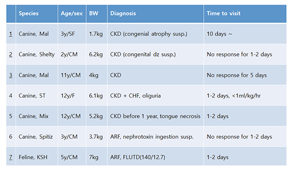 다음은 신부전 환자에게 혈액투석을 적용한 7증례를 소개하고자 한다. 2017년에 로얄동물메디컬센터에서 총 6마리의 개와 1마리의 고양이에게 혈액투석을 진행하였다. 만성신부전 환자가 개 5마리였고, 급성신부전환자가 개 1마리, 고양이 1마리였다. 종은 말티즈 2마리, 시츄 1마리, 셔틀랜드쉽독 1마리, 스피츠 1마리, 믹스견 1마리, 코리안숏헤어 1마리였다. 나이는 2년령에서 12살령까지였고, 중성화 수컷이 개 4마리와 고양이 1마리, 중성화암컷 개 1마리, 중성화안한 암컷 개 1마리였다. 몸무게는 1.7kg부터 7kg까지였다.