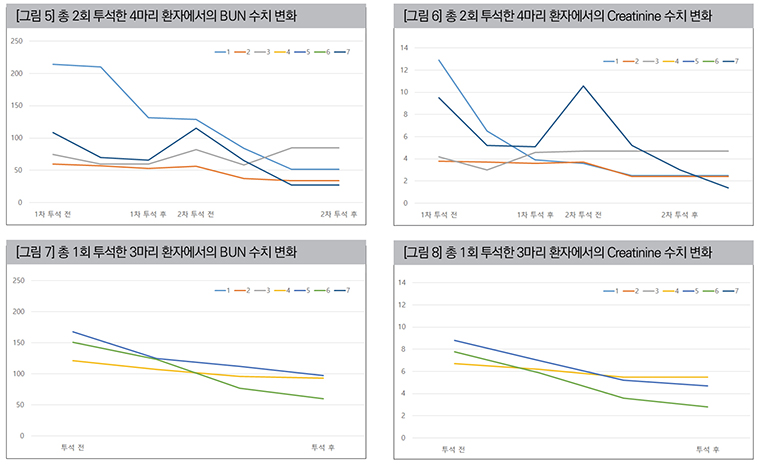 혈액투석은 대부분 간헐적 혈액투석에 준하여 투석시간을 진행하였고, 가능하면 지속적 혈액투석에 준하여 최대한 오랫동안 투석하려고 노력하였다. 7마리 중 4마리는 3~4일 동안 3~4시간에 걸쳐 2회 투석을 진행하였고, 나머지는 하루 동안 5~8시간에 걸쳐 1회 투석을 진행하였다[그림 4].