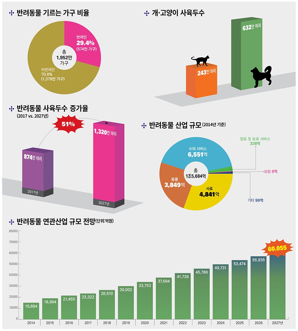 한국농촌경제연구원이 전국 만 20~69세 성인 2,000명을 대상으로 반려동물 사육현황을 조사한 결과, 2017년 전국 1,952만 가구 중 29.4%인 574만 가구가 총 874만 마리의 반려동물을 기르는 것으로 나타났다. 반려동물 연관산업 규모는 연평균 14.5%씩 성장해 2027년 6조원 이상 성장할 것으로 전망, 애초 예상했던 2020년 6조 시장은 2027년으로 7년 늦춰졌다. <편집자주>