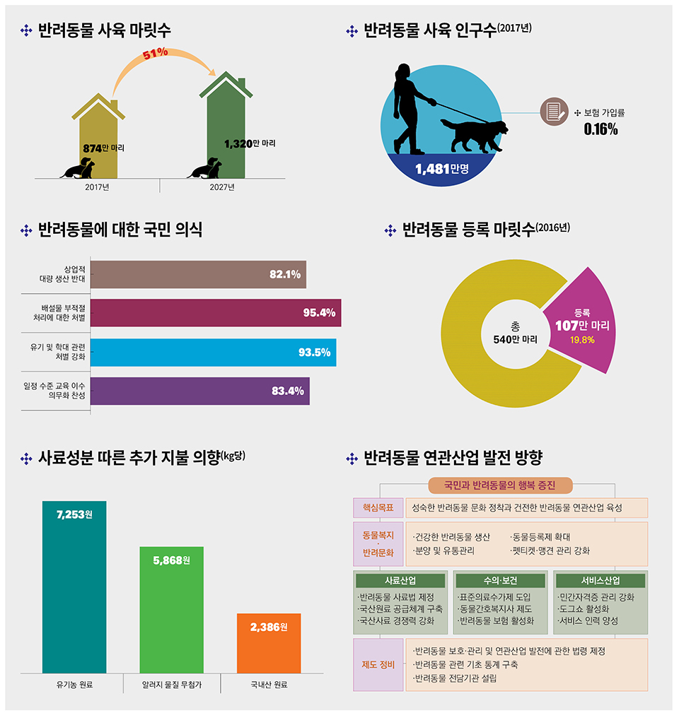한국농촌경제연구원이 전국 만 20~69세 성인 2,000명을 대상으로 반려동물 사육현황을 조사한 결과, 2017년 반려동물 사육 인구수는 총 1,481만 명으로, 사육 마릿수는 2017년 874만 마리에서 10년 후인 2027년에는 1,320만 마리로 51% 이상 성장할 것으로 내다봤다.
