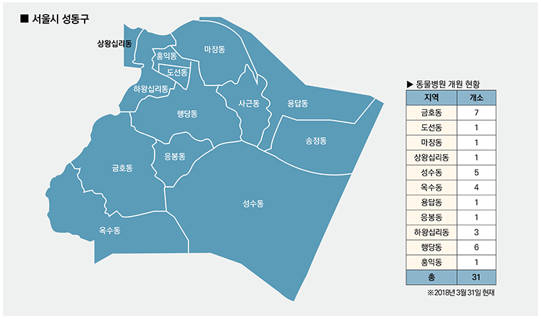 성동구의 이런 변화는 수의사들의 관심을 모으면서 2016년 한 해에만 7개의 동물병원이 개원하는 기현상이 나타났다. 2018년 3월 31일 현재 31곳의 동물병원이 개원하고 있음을 감안하면 22%의 동물병원이 한꺼번에 성동구에 개원한 셈이다.