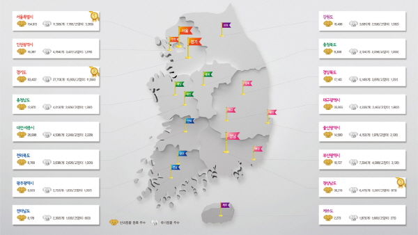 유기동물의 시·도별 발생현황을 보면 경기도가 2만8천 마리(28.5%), 서울 1만1천 마리(11.7%), 부산 7천 마리(7.5%) 순으로 나타나 발생 마리수는 사육 마리수에 비례하고, 시·도의 유기동물 관리시설 등에 따라 다르게 나타나는 것으로 판단된다.