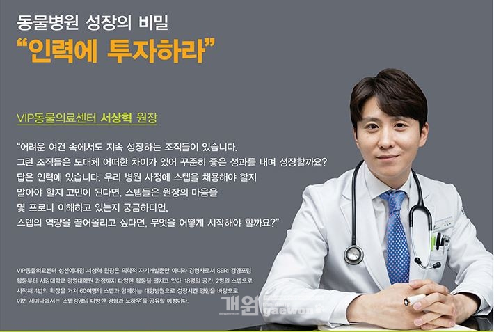 이런 서상혁 원장의 풍부한 경험을 바탕으로 이번 세미나는 동물병원 스텝 경영의 다양한 경험과 노하우를 공유할 수 있는 절호의 기회가 될 전망이다.