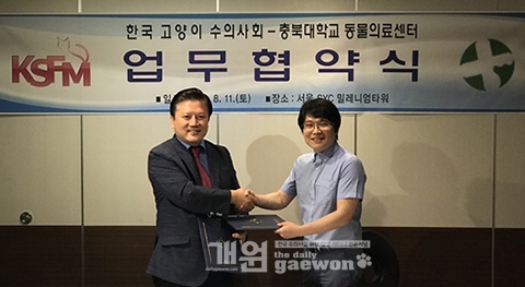 충북대학교 동물의료센터(센터장 강병택)와 한국고양이수의사회(회장 김재영, 이하 KSFM)가 지난 8월 11일 서울 SYC밀레니엄타워에서 상호 업무협약(MOU)을 체결했다.