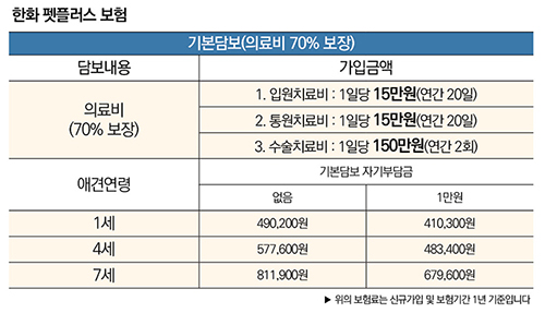 한화손해보험이 출시한 펫보험은 자기부담금을 1만원에서 3만원까지 선택할 수 있다.