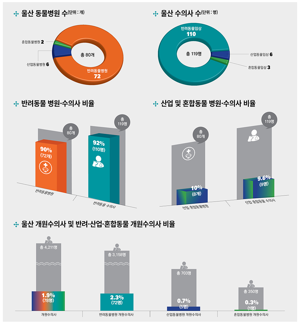 울산에 개원한 수의사는 전체 개원 수의사 4,211명 중 78명으로 1.9%가 울산에 개원했으며, 반려동물병원을 개원한 수의사는 전국 총 3,158명 중 72명으로 2.3%가 울산에 개원한 것으로 조사됐다. <편집자주>