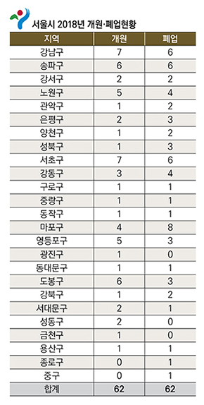 송파구도 지난해 9곳이 폐업을 신청했으나 올해는 6곳에 그치며 폐업율이 감소하고 있는 것으로 나타났다.
