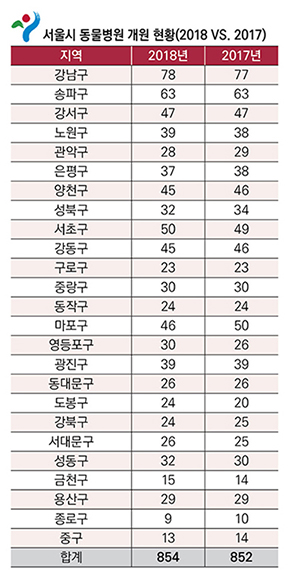 2018년 서울시 동물병원 수는 총 854개소로 25개 전 구에 고르게 분포돼 있다. 그 중 강남이 전체 동물병원 중 9%(78개소)로 가장 많이 개원하고 있으며, 다음이 송파구 7%(63개소), 서초구 6%(50개소) 순으로 나타났다. 가장 적게 개원하고 있는 지역은 종로구(9개소), 중구(13개소), 금천구(15개소) 순으로 조사됐다.
