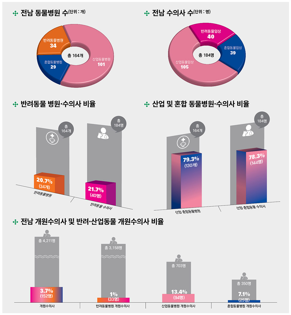 대한수의사회지가 발표한 2017년 10월 현재 각 시도별 동물병원 현황에 따르면, 전라남도 5개시 17개군에 동물병원 수는 총 164개, 수의사 수는 총 184명으로 조사됐다. 이 중 반려동물병원은 34개로 20.7%, 반려동물 수의사는 40명으로 21.7%를 차지했다.
