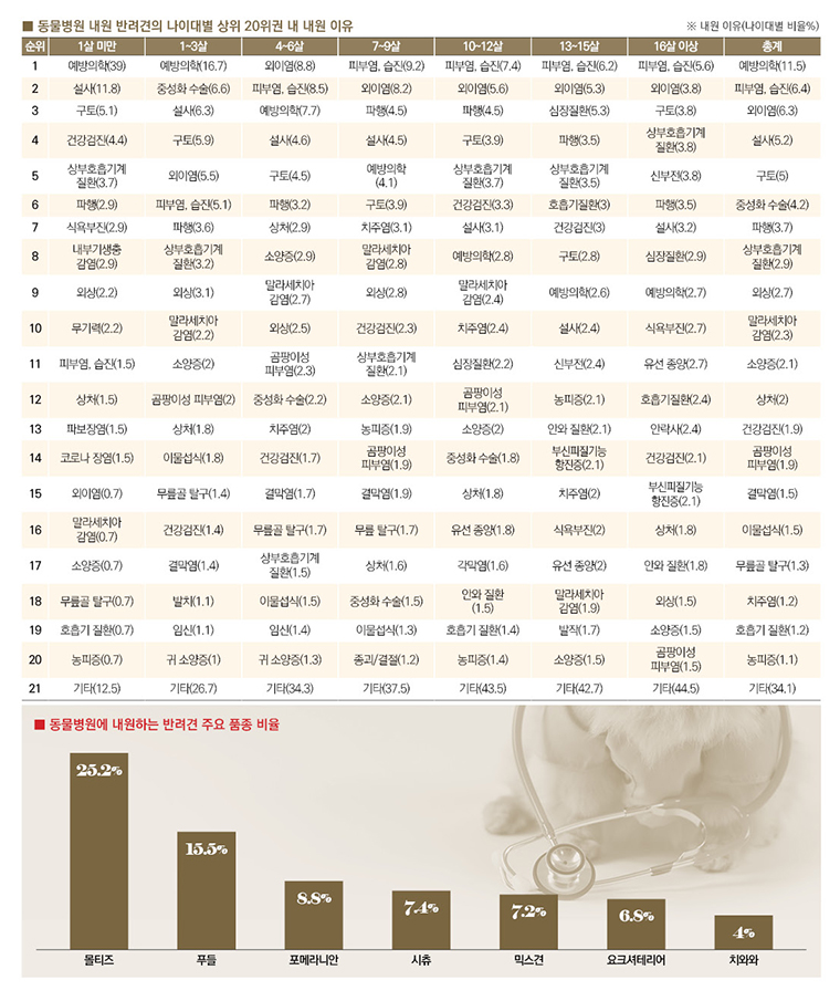 농촌진흥청이 동물병원 전자 차트를 바탕으로 반려견의 나이와 품종에 따른 내원 원인을 분석한 결과, 1~3세가 53%로 내원율이 가장 높았으며, 4~6살은 17.3%로 급격히 줄어드는 것으로 나타났다.