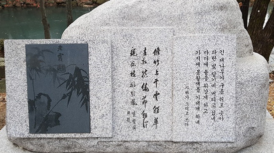 시비에는 원문과 번역이 다음과 같이 쓰여 있다. ‘脩竹上干雲 彩翠支相控 繞節解從龍 依枝頻引鳳 紫霞寫因題-긴 대나무가 구름 위로 솟아 파란 빛 당기며 버티고 섰네. 마디에 용을 휘감게 하고, 가지에 봉황새를 기대게 하네’