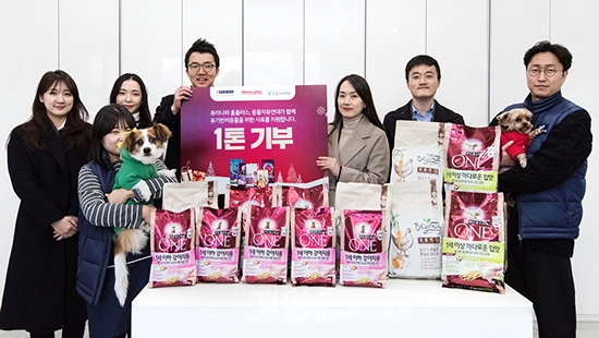 네슬레 퓨리나가 지난 1월 17일 홈플러스와 함께 동물자유연대가 운영하는 ‘반려동물복지센터’ 유기동물들에게 사료 1톤을 기부하는 전달식을 가졌다.