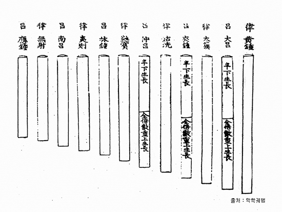 한편 기장 한 알의 폭을 1푼(分)이라고 하고, 10푼을 1촌, 10촌을 1척, 10척을 1장, 10장이 1인이라 하니, 황종율관의 길이9촌은 90알의 기장을 일렬로 늘어놓은 길이와 일치한다.