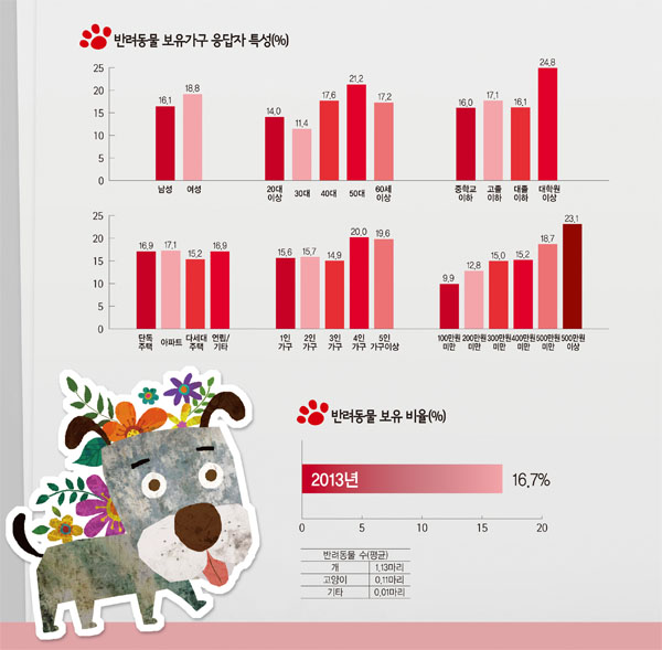 서울시가 ‘2013 서울서베이 도시정책지표조사’ 결과를 최근 발표했다. 2013년 서울시민의 삶의 질, 행복과 안전지수를 측정한 이번 조사에서 서울시는 지난해 처음으로 반려동물 시장을 조사, 서울 거주가구의 16.7%가 반려동물을 키우고 있는 것으로 나타났다. 또 가구주가 50대(21.2%), 학력은 대학원 이상(24.8%), 소득은 500만 원 이상(23.1%) 가구에서 ‘반려동물이 있다’는 응답이 높게 나타났다.